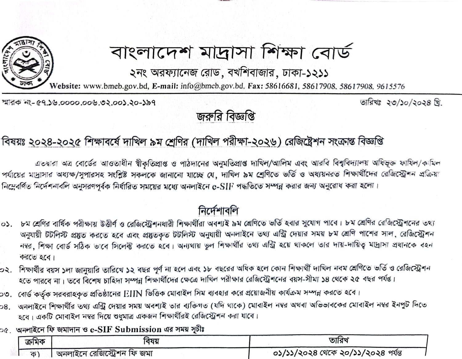 শিরোনাম : ৯ম শ্রেণির রেজিস্টেশন বিজ্ঞপ্তি -২০২৪