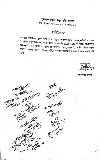আগামী ২৮/০৯/২০২৩ ইং তারিখ পবিত্র ঈদ- ই-মিলাদুন্নবী (সা:) উপলক্ষে মাদ্রাসা ১দিনের জন্য বন্ধ থাকবে।