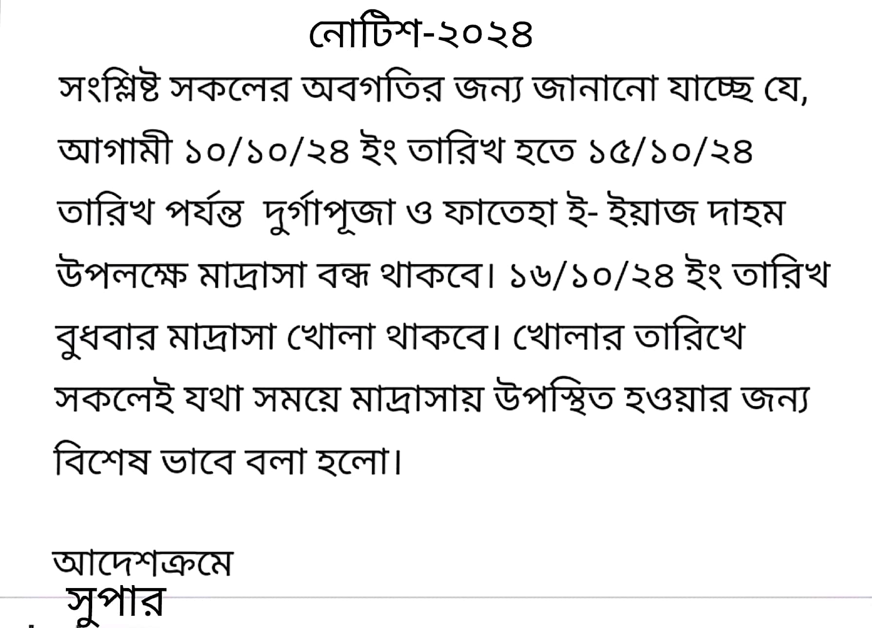 শিরোনাম : দুর্গাপূজা ও ফাতেহা ই ইয়াজ দাহম এর বন্ধের নোটিশ