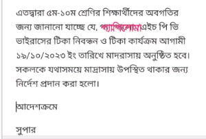 আগামী ১৯/১০/২০২৩ ইং তারিখ মাদ্রাসা ক্যাম্পাসে সকাল ১০টা হতে ৫ম-৯ম শ্রেণির শিক্ষার্থীদের হিউম্যান প্যাপিলোমা (এইচ পি ভি) টিকা দেয়া হবে। সকলকে যথাসময়ে মাদ্রাসায় উপস্থিত থাকতে হবে। উল্লেখ্য সকল শিক্ষার্থীকে আগামী ১৮/১০/২০২৩ ইং তারিখের মধ্যে নিজ উদ্যোগে টিকার নিবন্ধন কাজ সম্পন্ন করতে হবে।